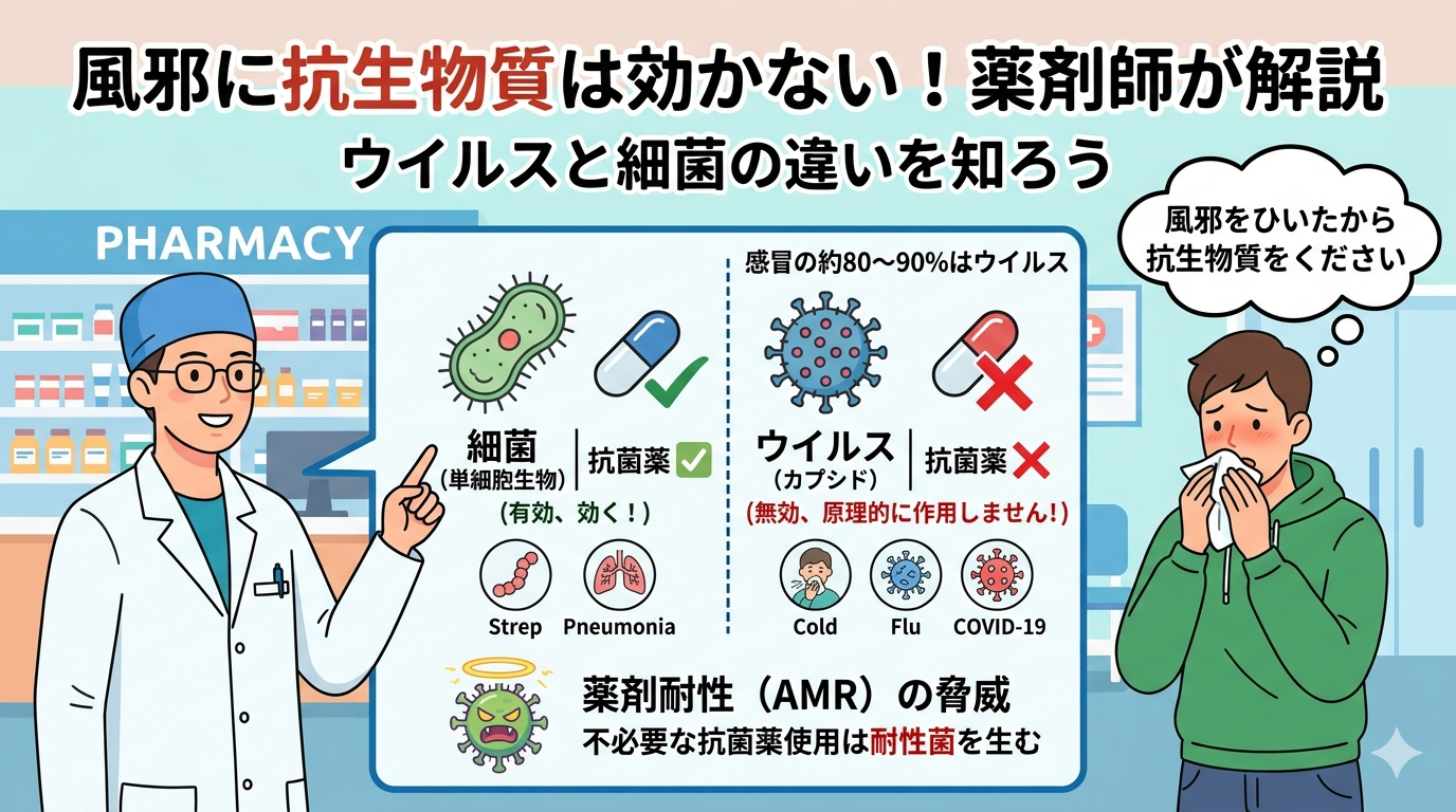 「風邪をひいたから抗生物質をください」という時折、病院で聞くこの言葉。実はほとんどの「風邪」に抗菌薬は無効です。根拠のある数値と国内外のガイドラインをもとに、薬剤師の視点でわかりやすく解説します。