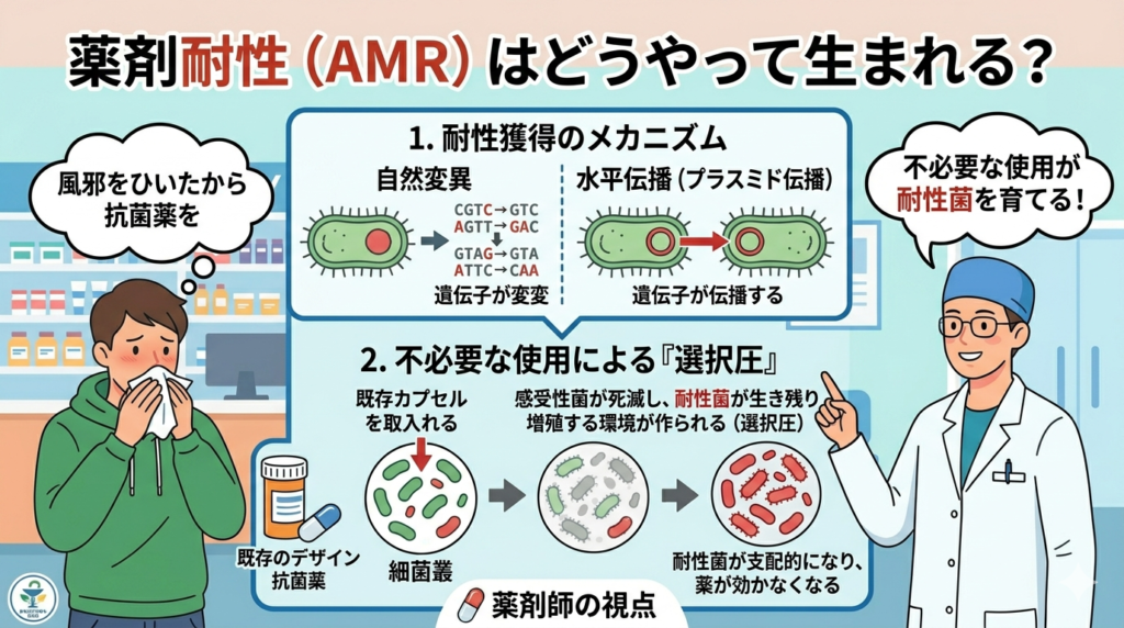 細菌は主に①自然変異による耐性遺伝子の獲得、②プラスミドなどを介した耐性遺伝子の水平伝播、によって薬剤耐性を獲得します。抗菌薬を必要としない病態に抗菌薬を使用、つまり不必要使用をすると感受性菌が死滅し耐性菌が生存・増殖しやすい環境(選択圧)を作り出します。