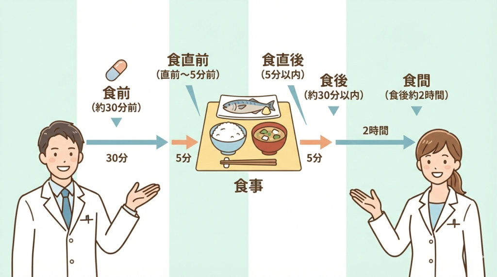 食直前は食事の5分以内が目安となります。10分以内も許容とされることがあります。食後の血糖上昇を抑える目的の薬がこの指示で処方されます。